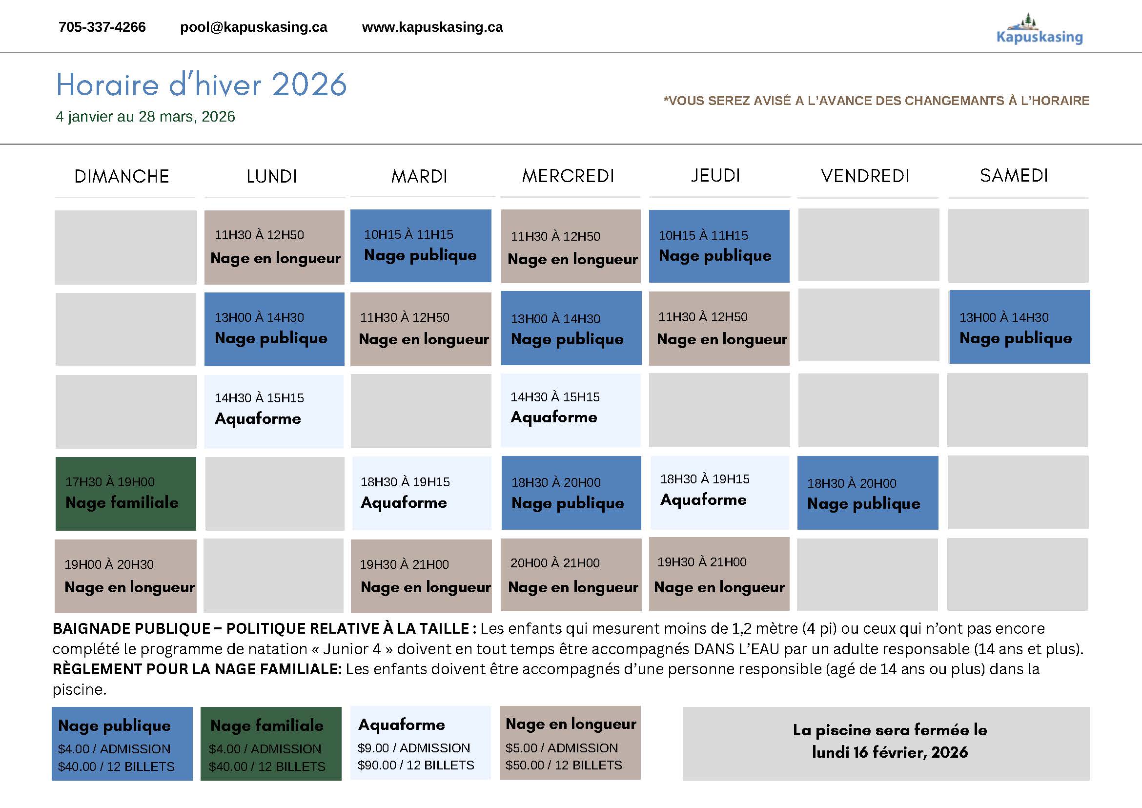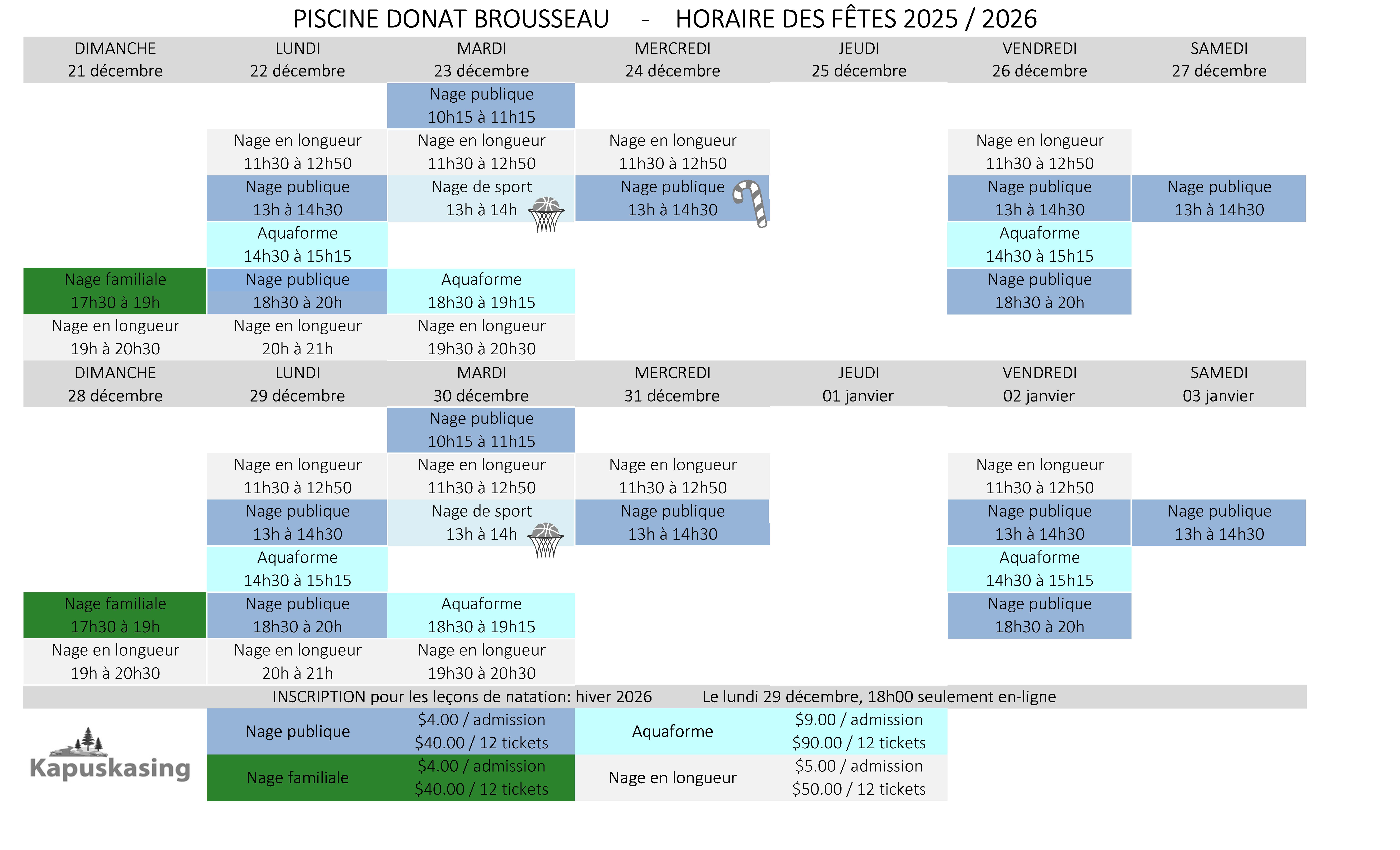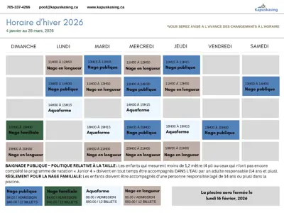 Les inscriptions en-ligne pour les leçons de natation d'hivers 2025-2026 auront lieu le lundi 29 décembre 2025 à 18h00.